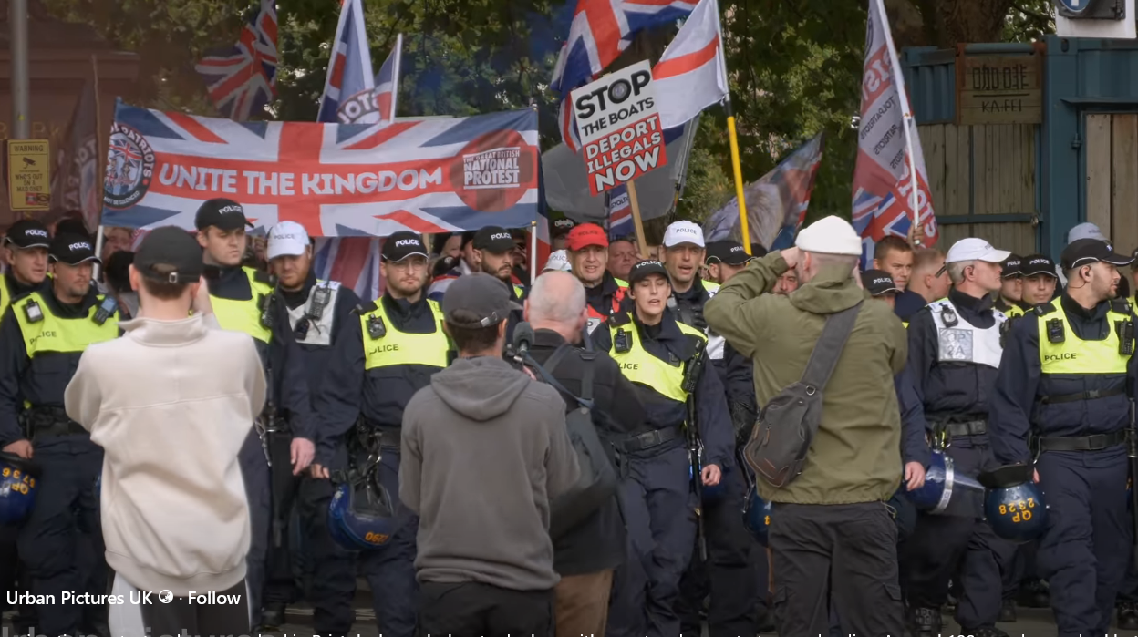 Meanwhile an identical scene was being played out in Bristol, UK, where British nationalists waving Union Jacks were harassed by a mob of leftist “anti-fascists” – probably from Bristol University and elsewhere.